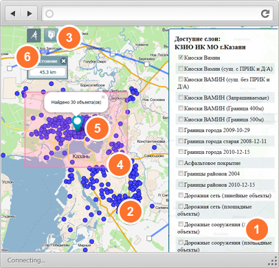 Включается первый или первые два слоя. Необходимо кликнуть на карту, чтобы получить список объектов в выбранной точке.